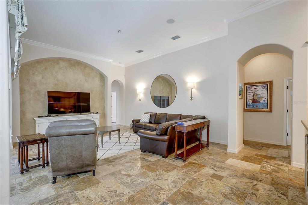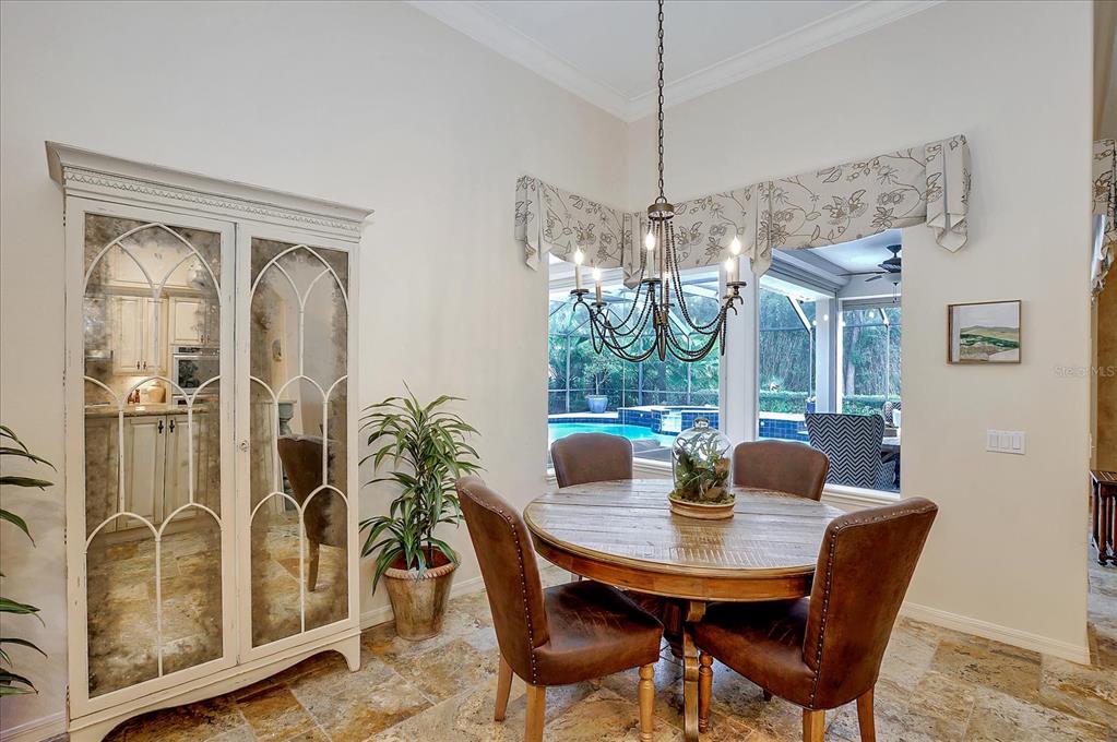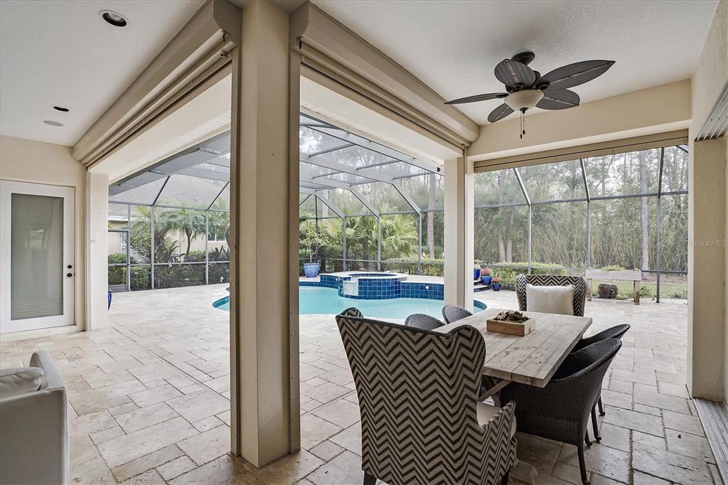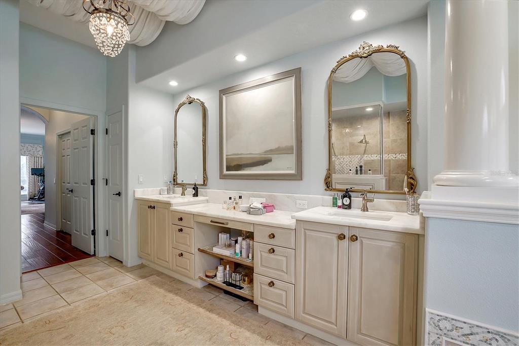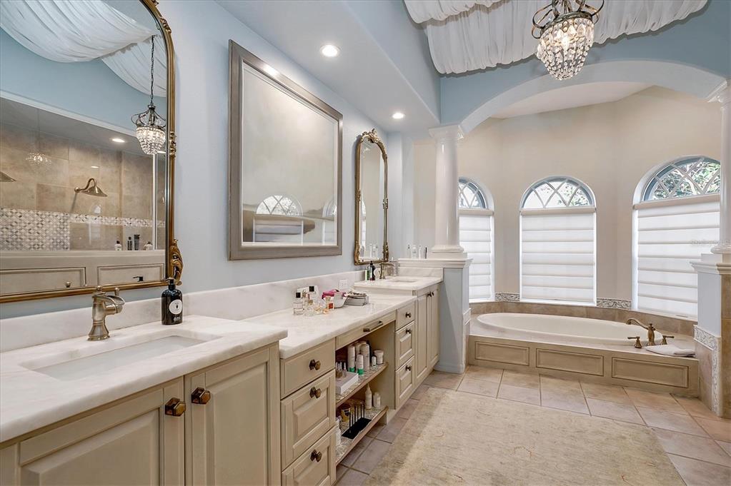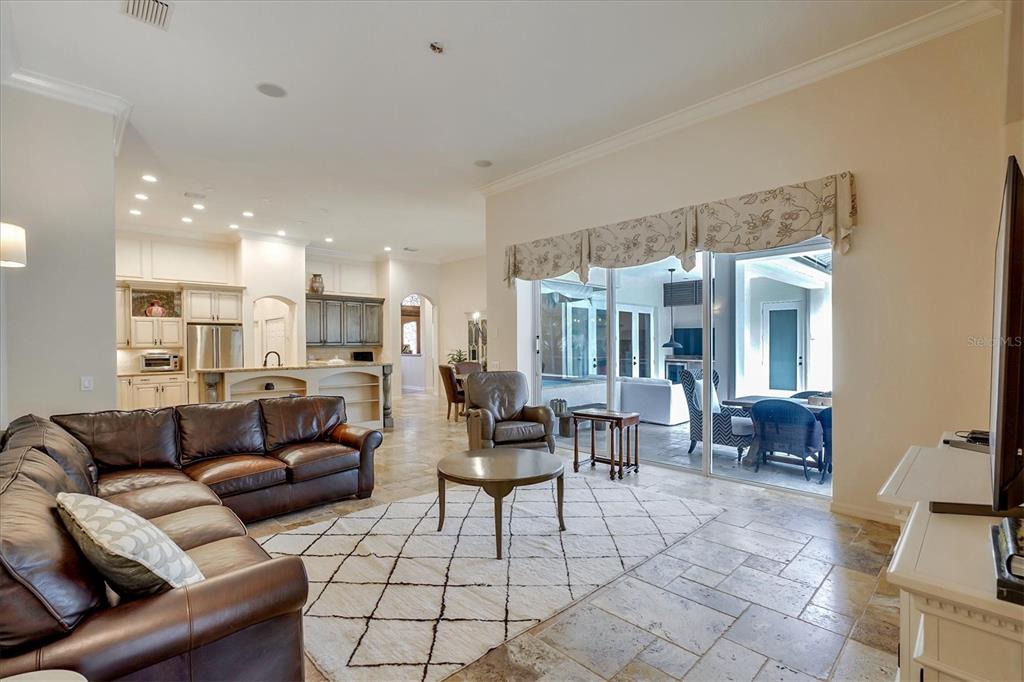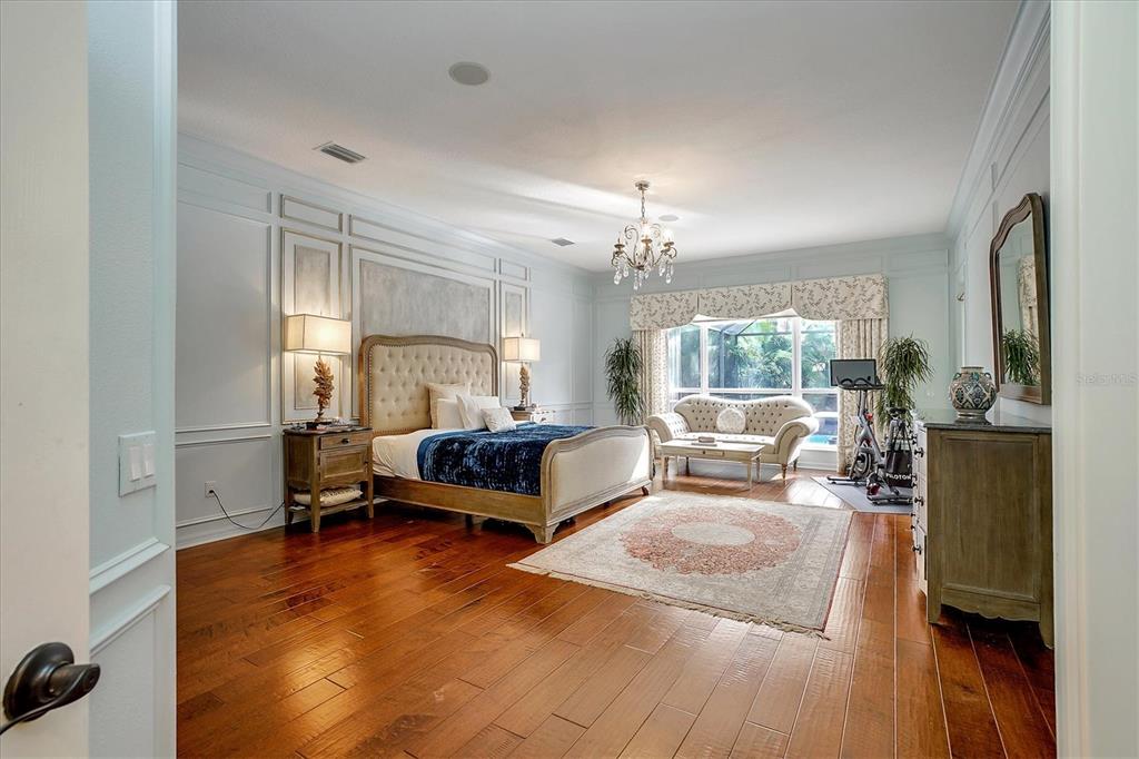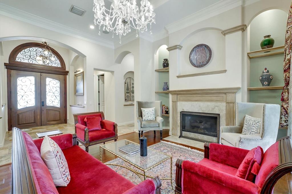 Back on the market! This home beckons buyers with discerning tastes for inviting sophistication and custom details. This beautifully renovated family pool home is in Tree Tops, an exclusive, private, gated community. After landing at Tampa International, a short drive will take you to your beautiful neighborhood and interior designed home that has been renovated to appeal to discerning tastes while keeping the home inviting and family-oriented. A custom designed, mahogany front door begins the list of high end finishes and improvements. High, tray ceilings greet you in the foyer and exquisite sitting room with a gas fireplace, imported Italian chandelier, built-in shelving and custom draperies. French pattern, brushed-chiseled travertine and cherry flooring is throughout the home. One floor living and a split bedroom plan bookend an open kitchen with custom cabinets, backsplash tile and stone countertops, a relaxing family room, and a stunning great room/library with built ins, a wall of windows and custom draperies, which all lead to a refurbished, caged saltwater, heated pool/spa, patio and private backyard. Custom millwork trim adorns the enviable office/5th bedroom and an imported Italian chandelier hangs from the high, tray ceiling in the Master Bedroom with en-suite bathroom and walk in closets. All bathrooms have been fully remodeled with quartz and/or marble vanities & shower/tub walls, custom cabinetry, Ferguson faucets and fixtures. A laundry room and three car garage make living here easy.